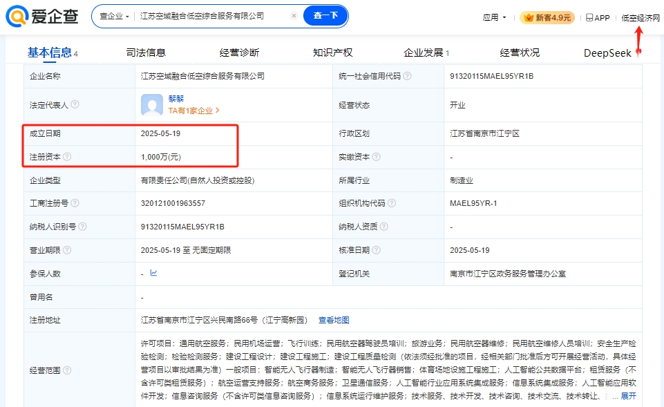 注册资本1000万,高度创新(广西)低空经济发展有限公司2025年12月10日成立,法人凌苑丹,注册于南宁西乡塘区。经营范围含智能无人飞行器制造销售等一般项目,及通用航空服务等许可项目,可凭执照依法开展经营。...